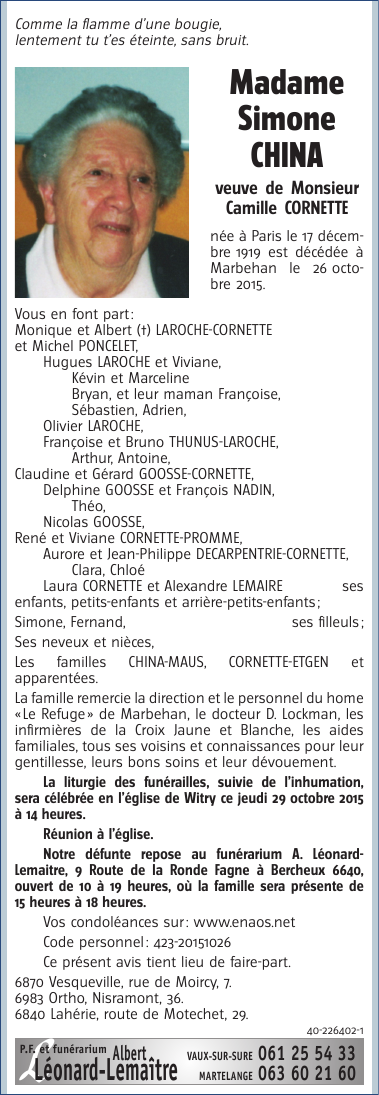 Décédée à Marbehan (6724) le lundi 26 octobre 2015 à l'âge de 95 ans