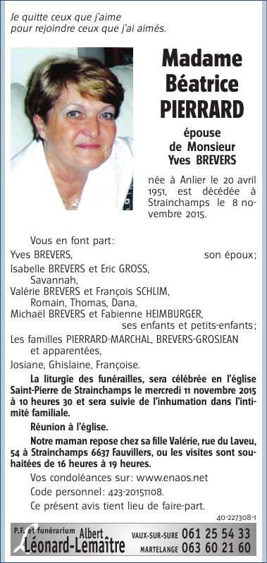Décédée à Strainchamps (6637) le dimanche 8 novembre 2015 à l'âge de 64 ans