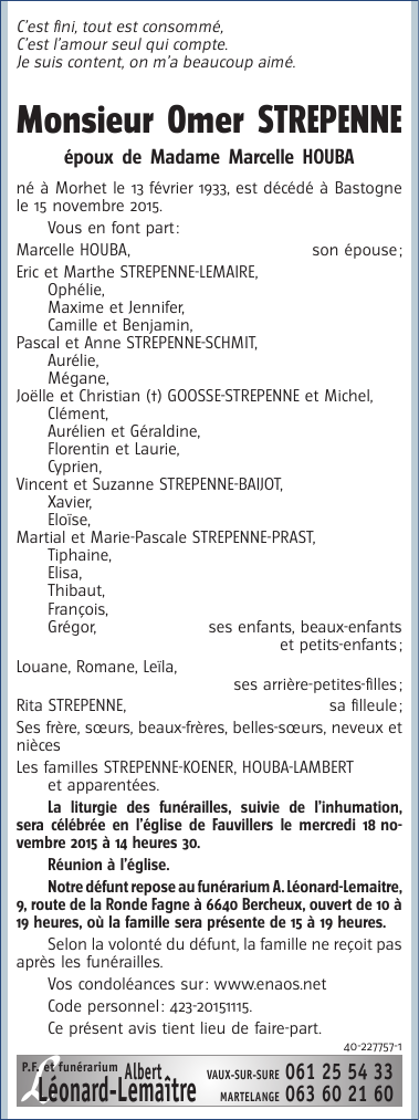 Décédé à Bastogne (6600) le dimanche 15 novembre 2015 à l'âge de 82 ans
