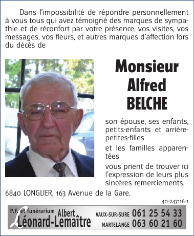Décédé à Neufchâteau (6840) le lundi 11 juillet 2016 à l'âge de 91 ans