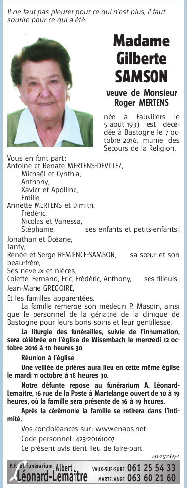 Décédée à Bastogne (6600) le vendredi 7 octobre 2016 à l'âge de 83 ans