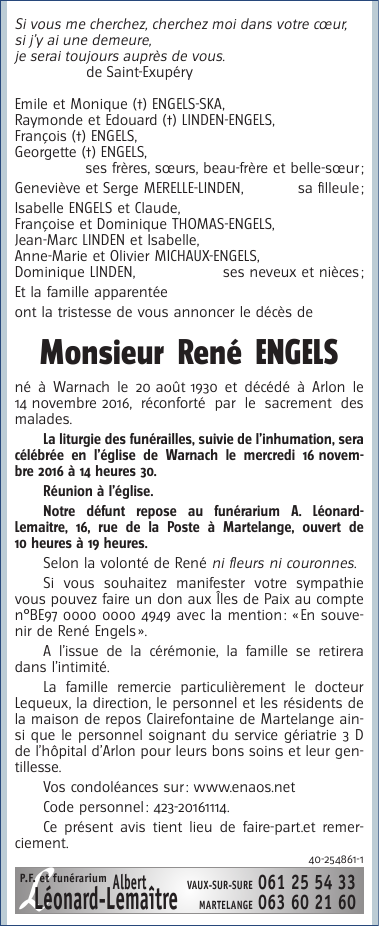 Décédé à Arlon (6700) le lundi 14 novembre 2016 à l'âge de 86 ans