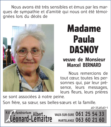 Décédée à Bastogne (6600) le samedi 29 octobre 2016 à l'âge de 84 ans