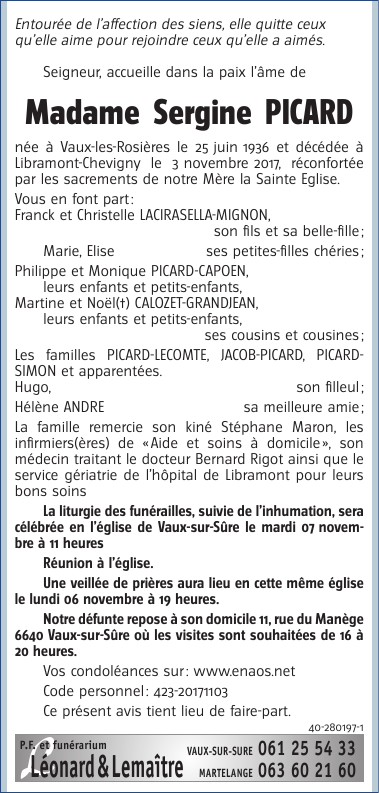 Décédée à Libramont-Chevigny (6800) le vendredi 3 novembre 2017 à l'âge de 81 ans