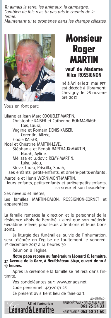 Décédé à Libramont-Chevigny (6800) le mardi 28 novembre 2017 à l'âge de 86 ans