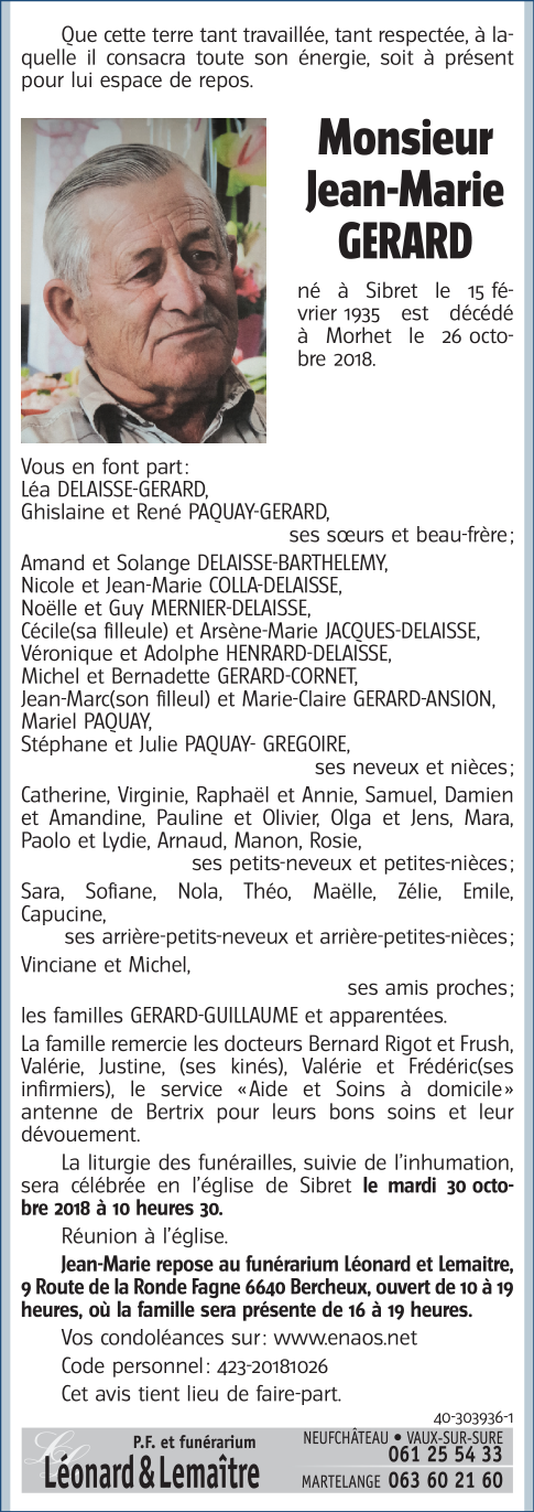Décédé à Vaux-sur-Sure (6640) le vendredi 26 octobre 2018 à l'âge de 83 ans