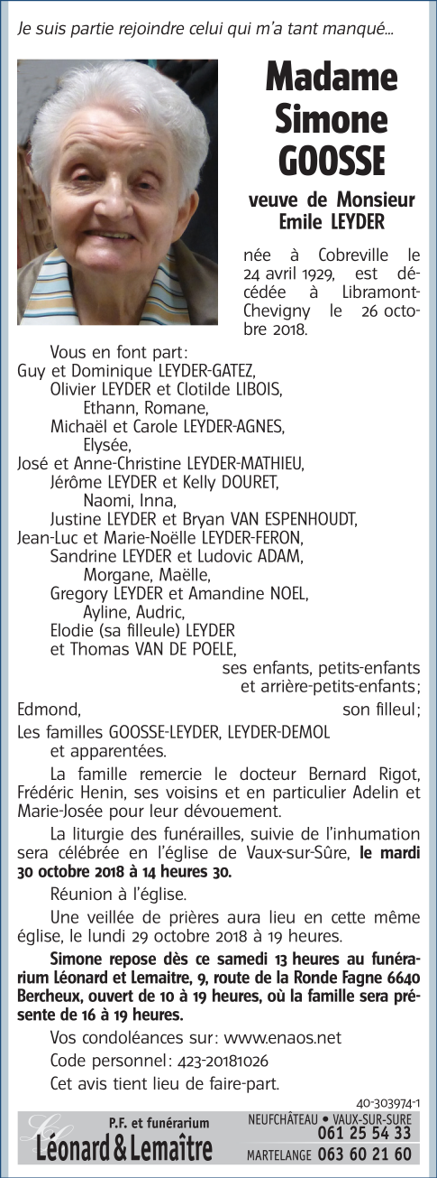 Décédée à Libramont-Chevigny (6800) le samedi 27 octobre 2018 à l'âge de 89 ans