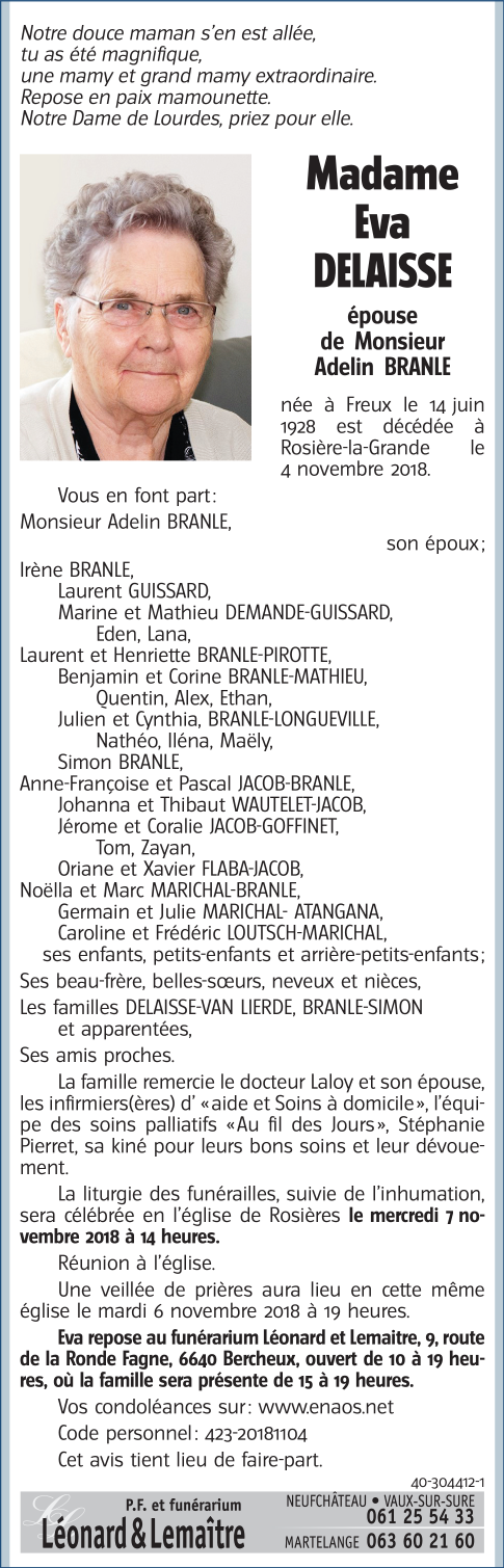 Décédée à Rosière-la-Grande (6640 ) le dimanche 4 novembre 2018 à l'âge de 90 ans