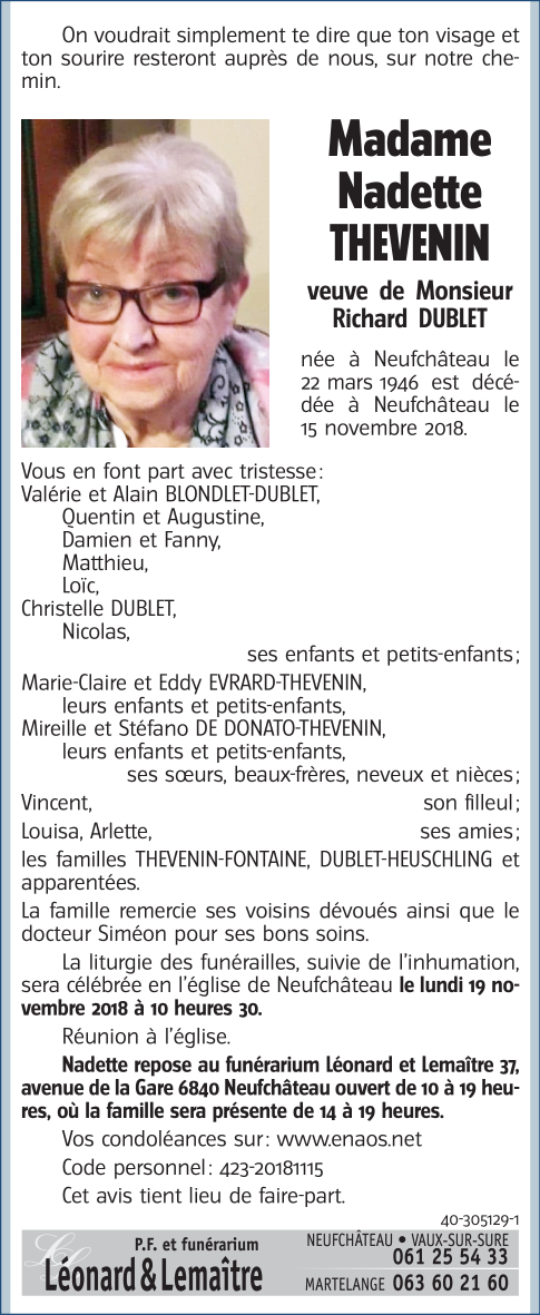 Décédée à Neufchâteau (6840) le jeudi 15 novembre 2018 à l'âge de 72 ans