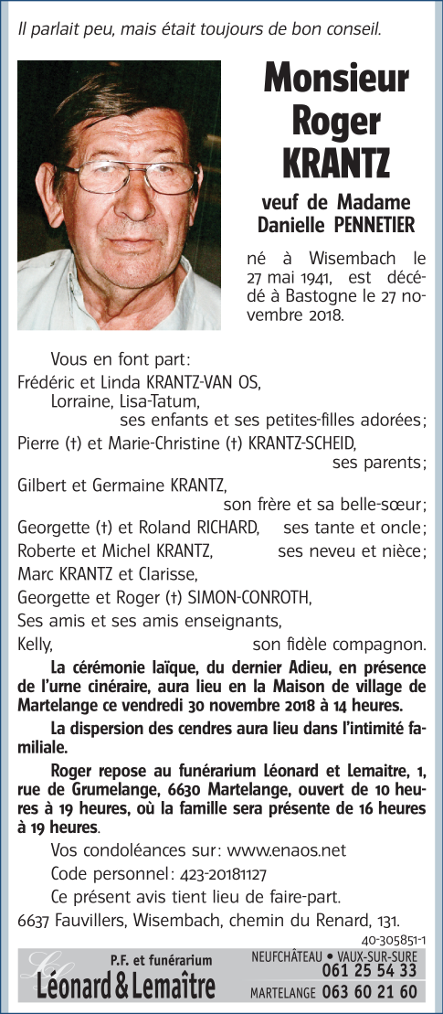 Décédé à Bastogne (6600) le mardi 27 novembre 2018 à l'âge de 77 ans
