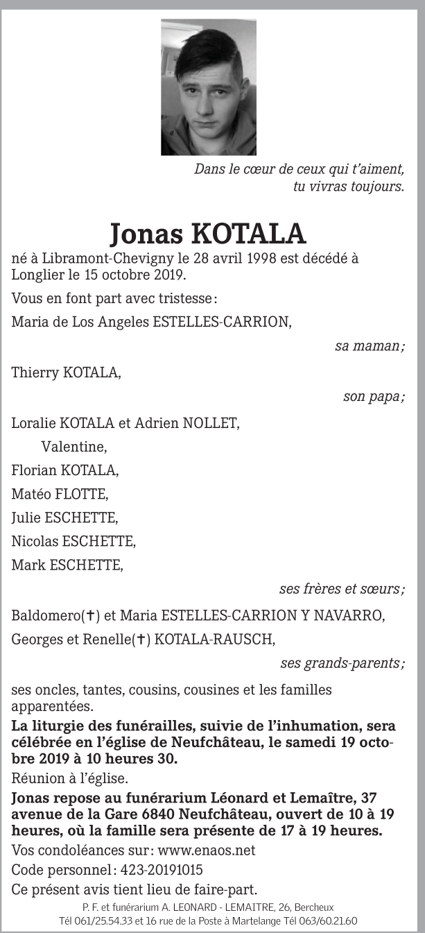 Décédé à Longlier (6840) le mardi 15 octobre 2019 à l'âge de 21 ans