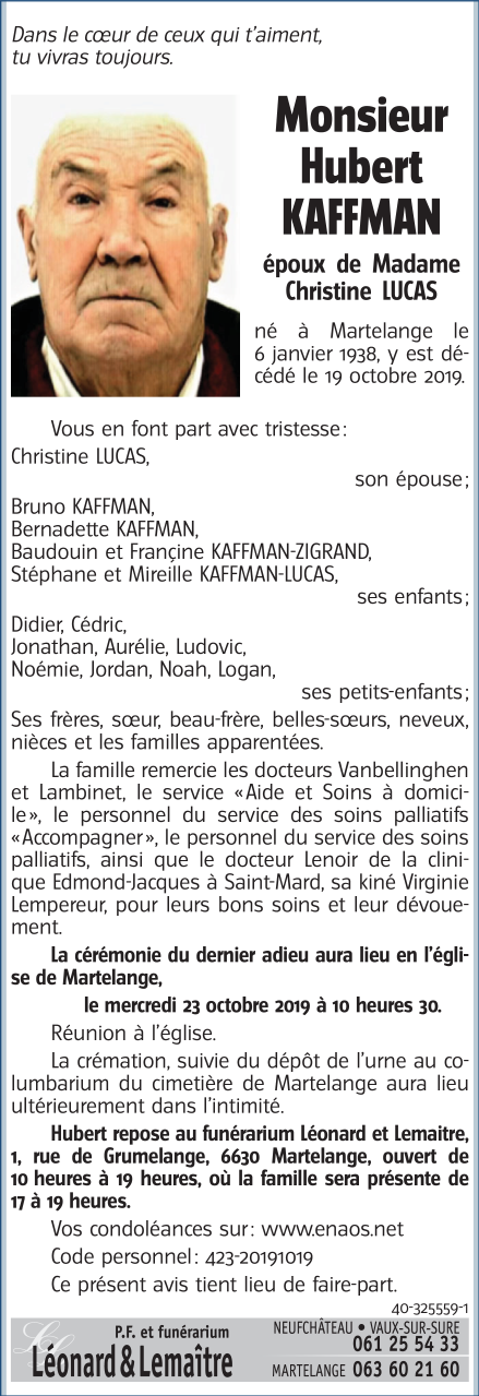Décédé à Martelange (6630) le samedi 19 octobre 2019 à l'âge de 81 ans