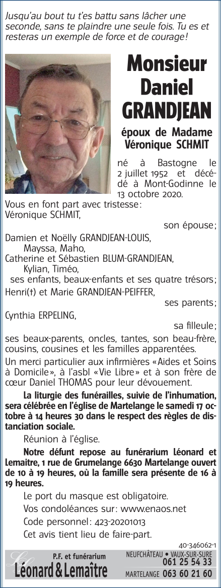 Décédé à Yvoir (5530) le mardi 13 octobre 2020 à l'âge de 68 ans