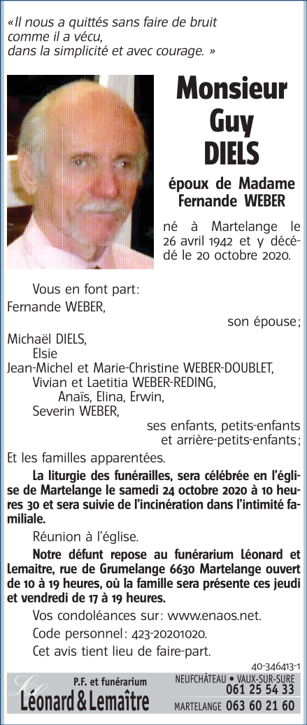 Décédé à Martelange (6630) le mardi 20 octobre 2020 à l'âge de 78 ans