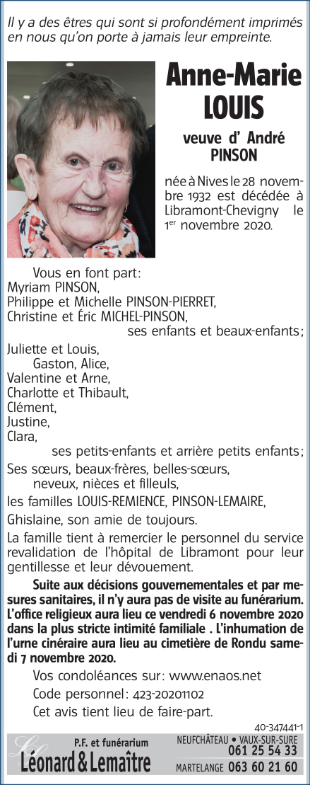 Décédée à Libramont-Chevigny (6800) le dimanche 1 novembre 2020 à l'âge de 87 ans
