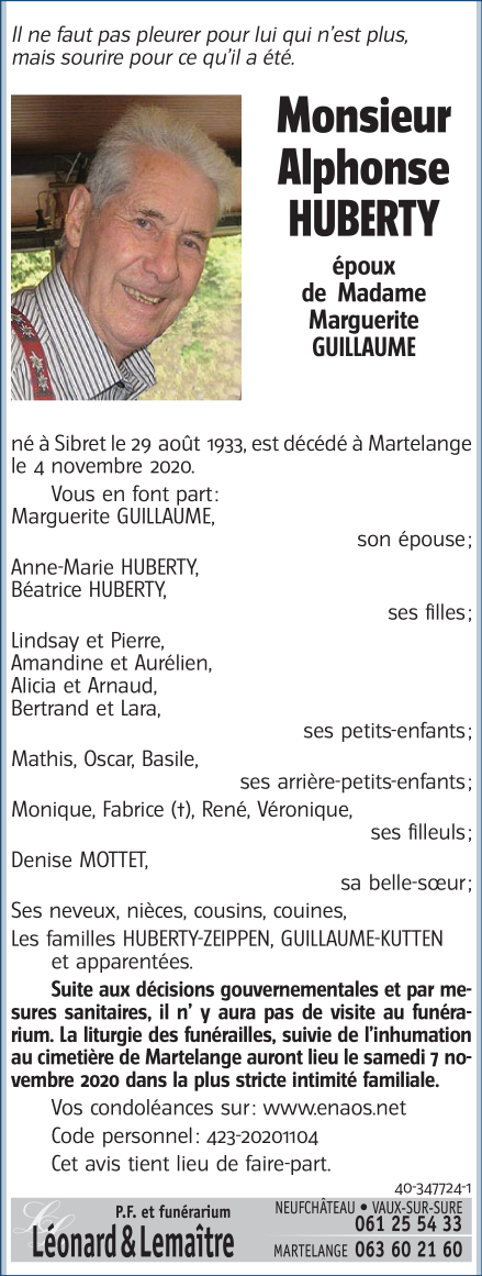 Décédé à Martelange (6630) le mercredi 4 novembre 2020 à l'âge de 87 ans
