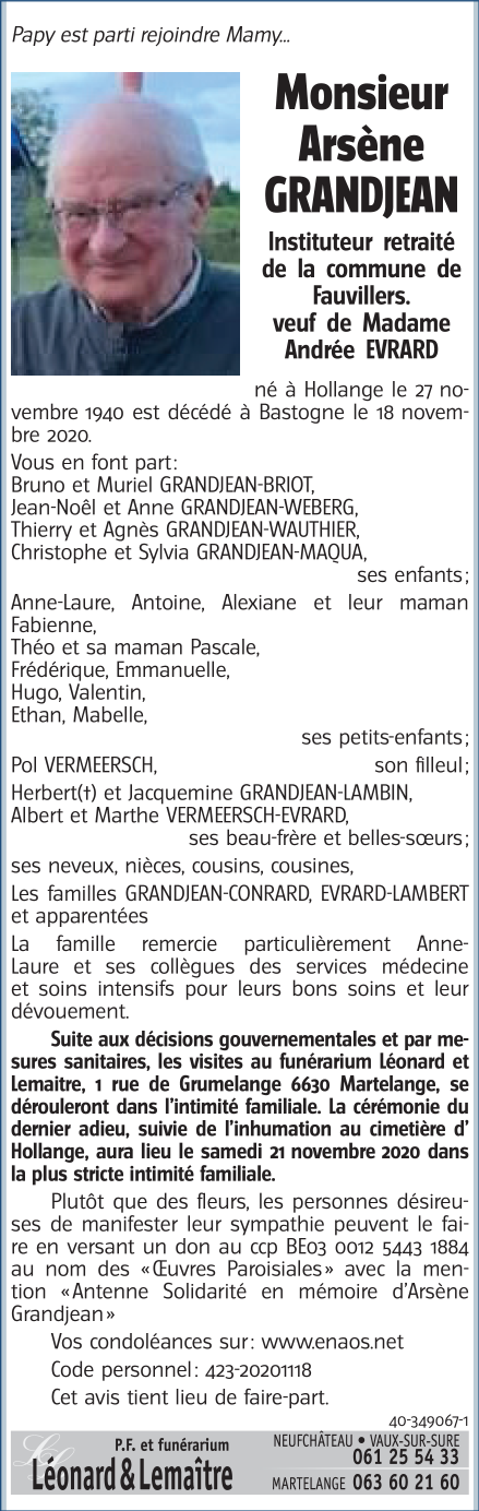 Décédé à Bastogne (6600) le mercredi 18 novembre 2020 à l'âge de 79 ans