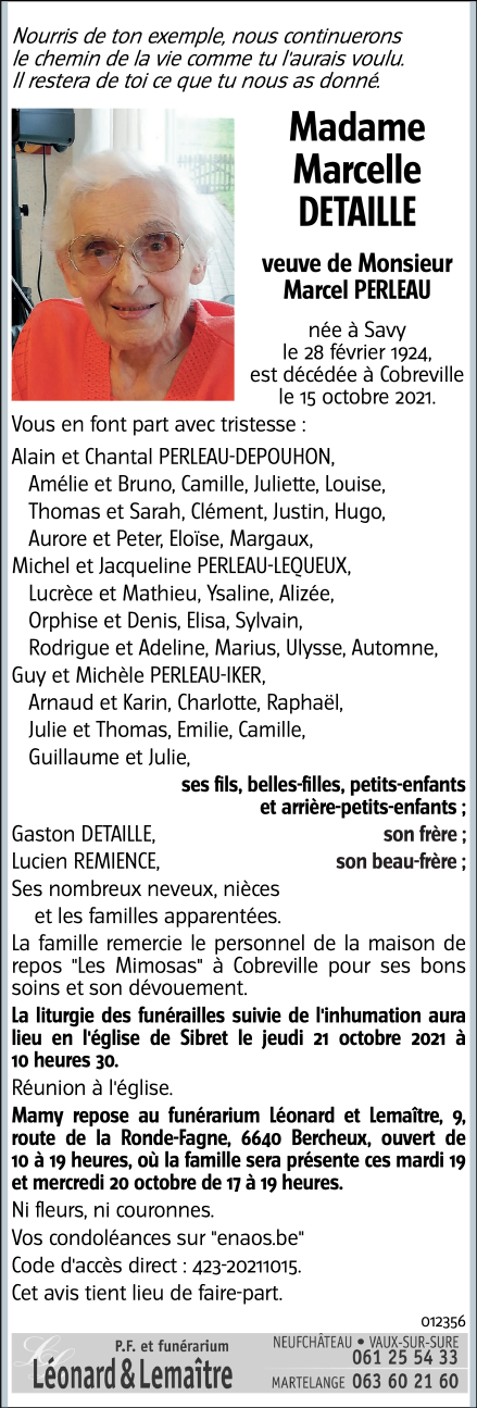 Décédée à Vaux-sur-Sure (6640) le vendredi 15 octobre 2021 à l'âge de 97 ans