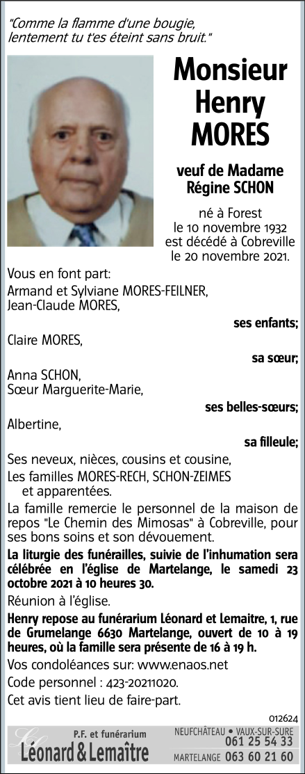 Décédé à Vaux-sur-Sure (6640) le mercredi 20 octobre 2021 à l'âge de 88 ans
