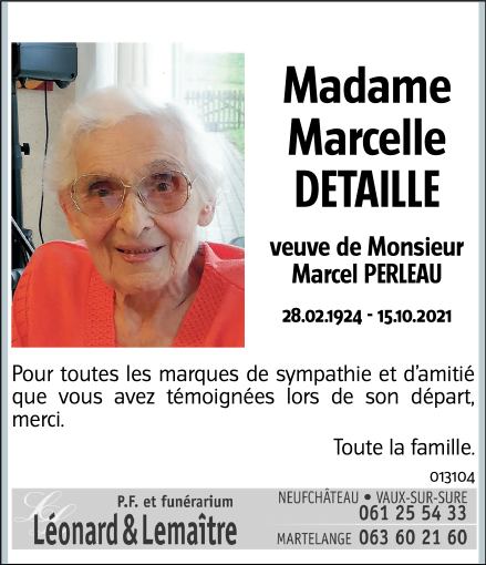 Décédée à Vaux-sur-Sure (6640) le vendredi 15 octobre 2021 à l'âge de 97 ans