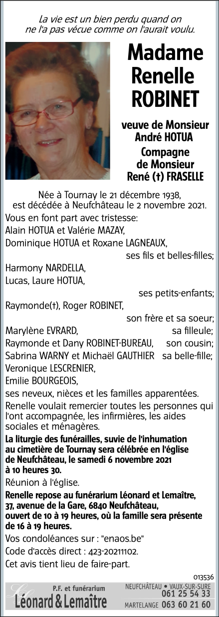 Décédée à Neufchâteau (6840) le mardi 2 novembre 2021 à l'âge de 82 ans