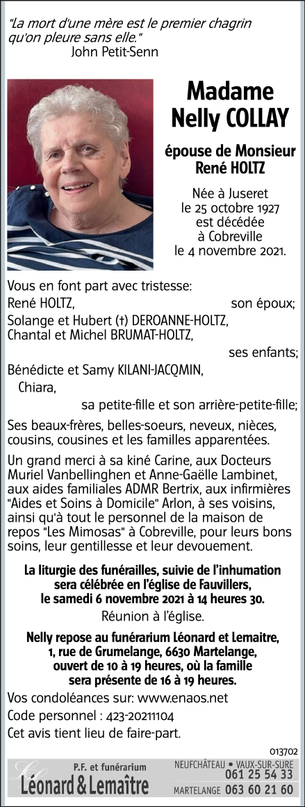 Décédée à Vaux-sur-Sure (6640) le jeudi 4 novembre 2021 à l'âge de 94 ans