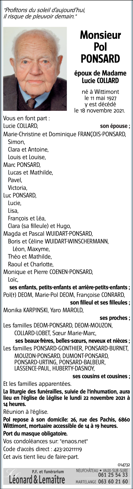 Décédé à Wittimont (6860) le jeudi 18 novembre 2021 à l'âge de 94 ans