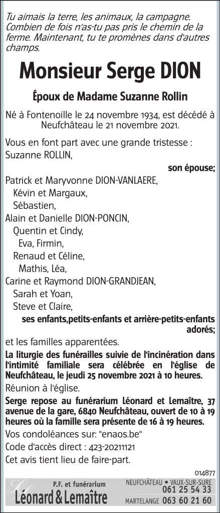 Décédé à Neufchâteau (6840) le dimanche 21 novembre 2021 à l'âge de 86 ans
