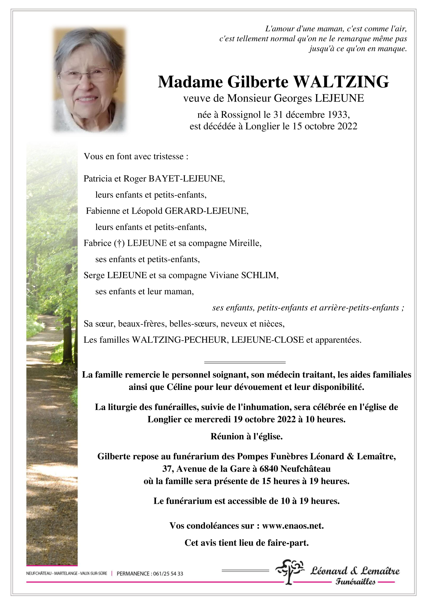 Décédée à Longlier (6840) le samedi 15 octobre 2022 à l'âge de 88 ans