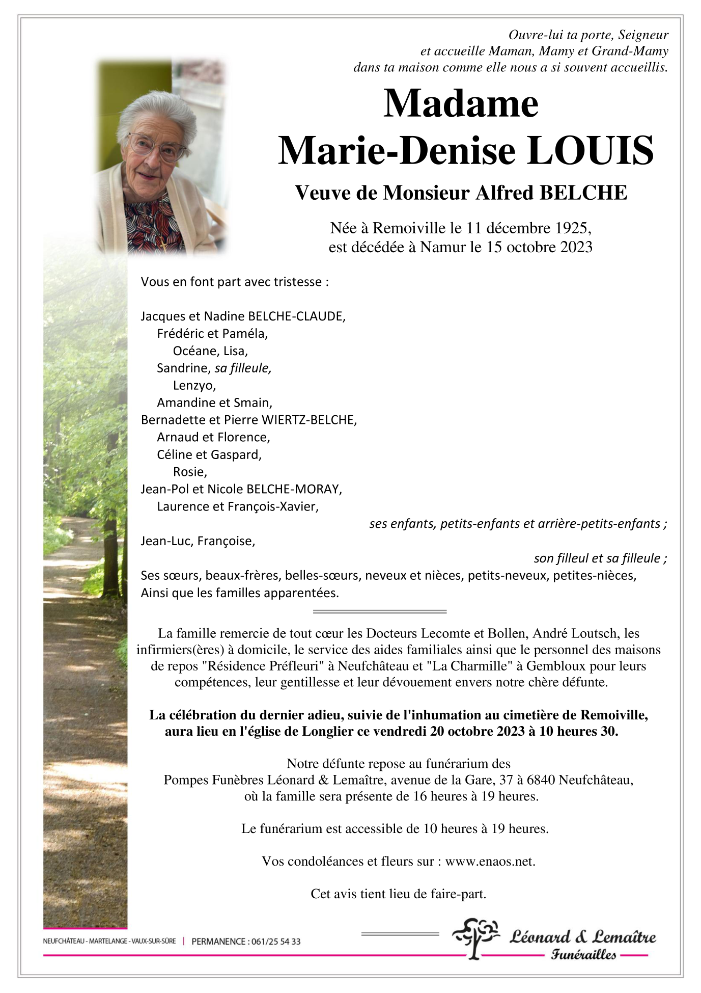 Décédée à Namur (5000) le dimanche 15 octobre 2023 à l'âge de 97 ans