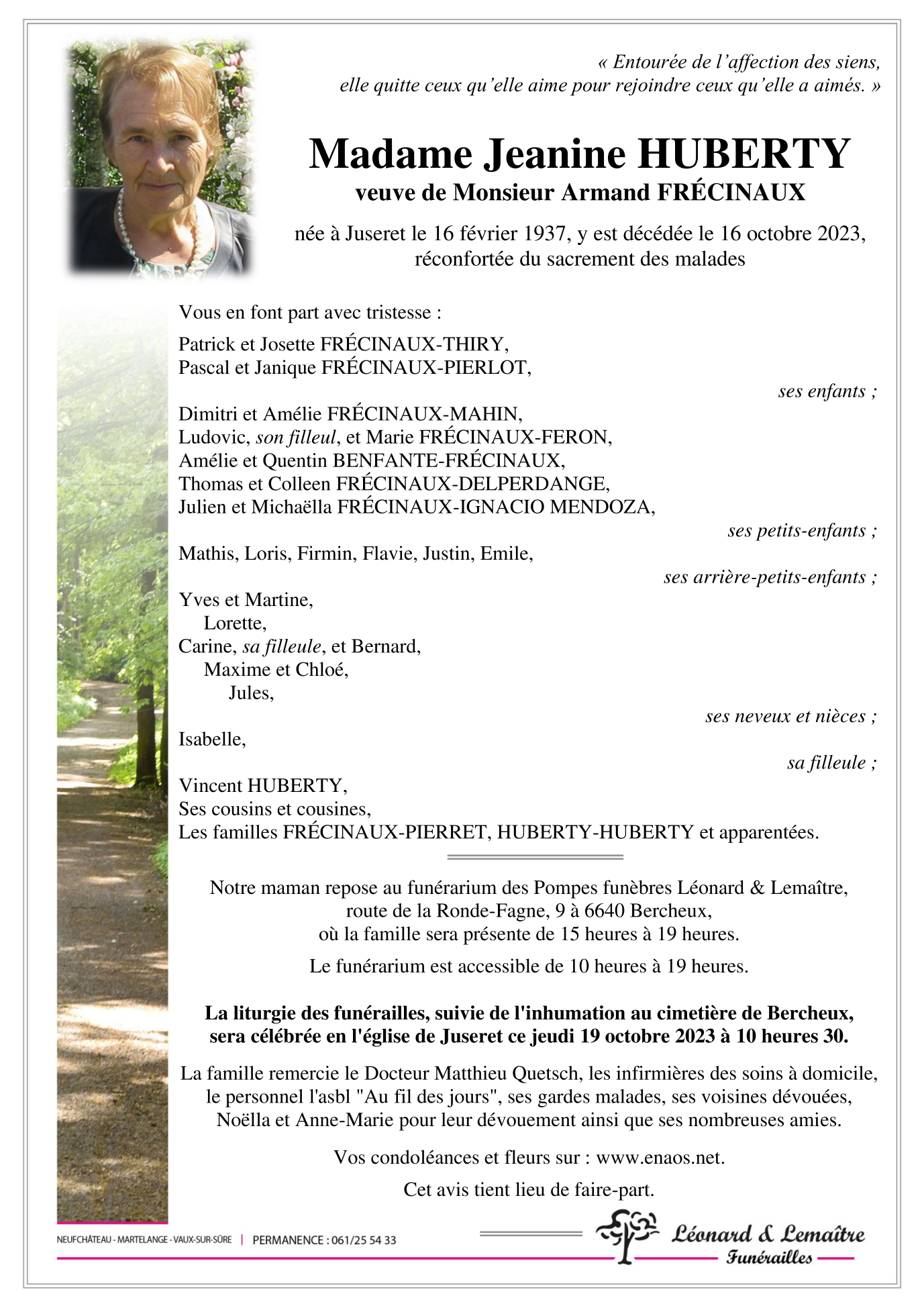 Décédée à Juseret (6640) le lundi 16 octobre 2023 à l'âge de 86 ans