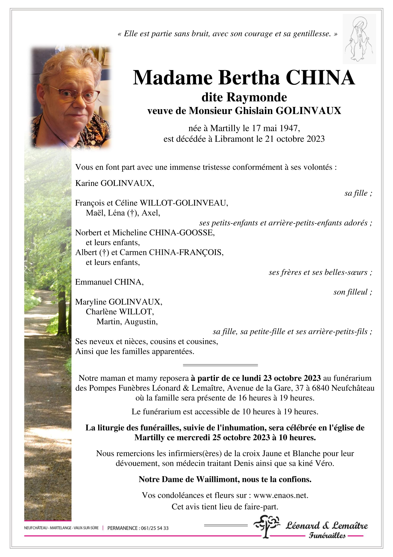 Décédée à Libramont-Chevigny (6800) le samedi 21 octobre 2023 à l'âge de 76 ans
