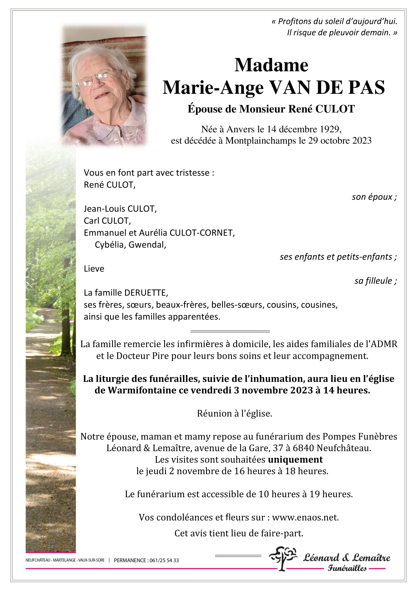 Décédée à Montplainchamps (6840) le dimanche 29 octobre 2023 à l'âge de 93 ans