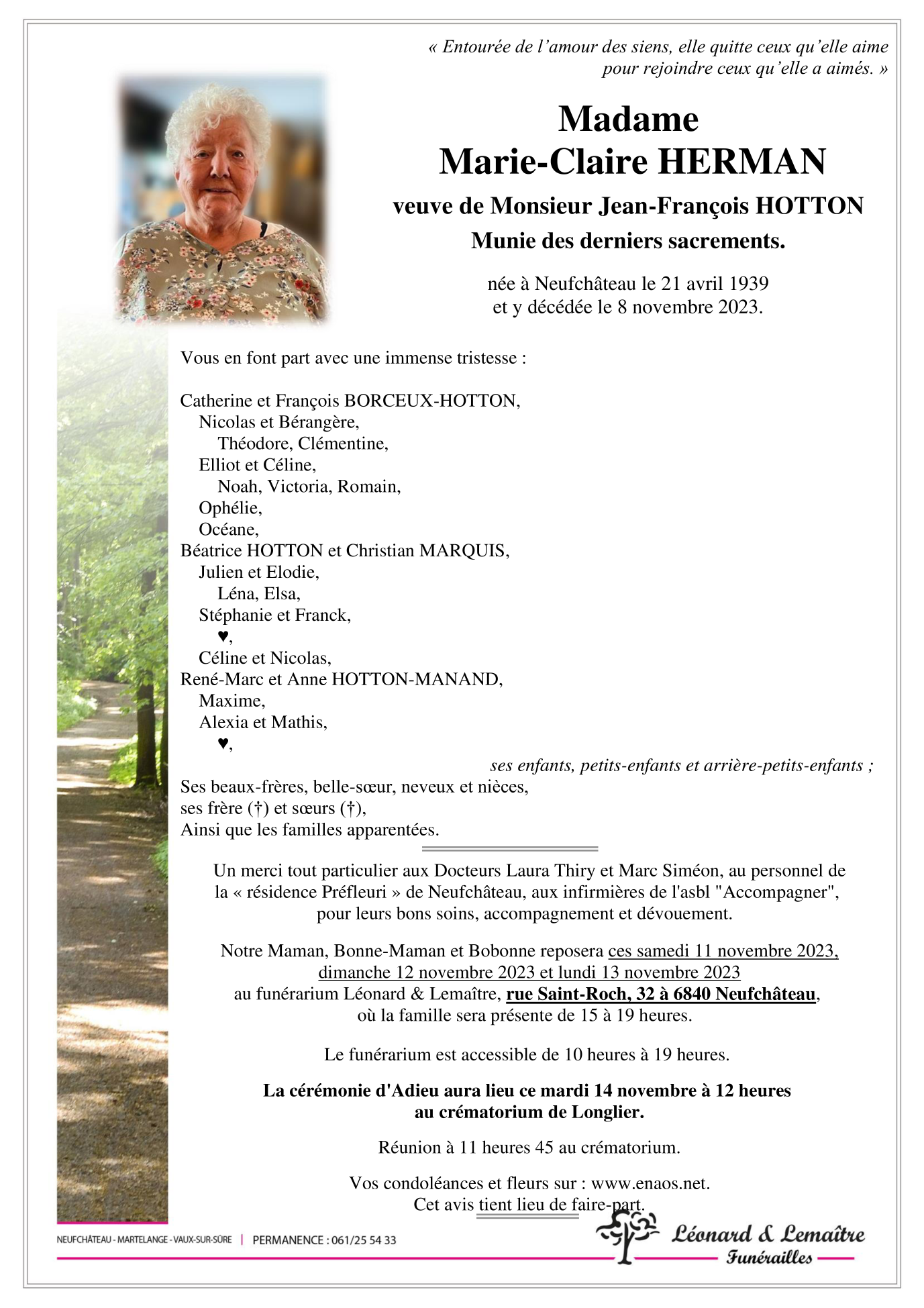Décédée à Neufchâteau (6840) le mercredi 8 novembre 2023 à l'âge de 84 ans