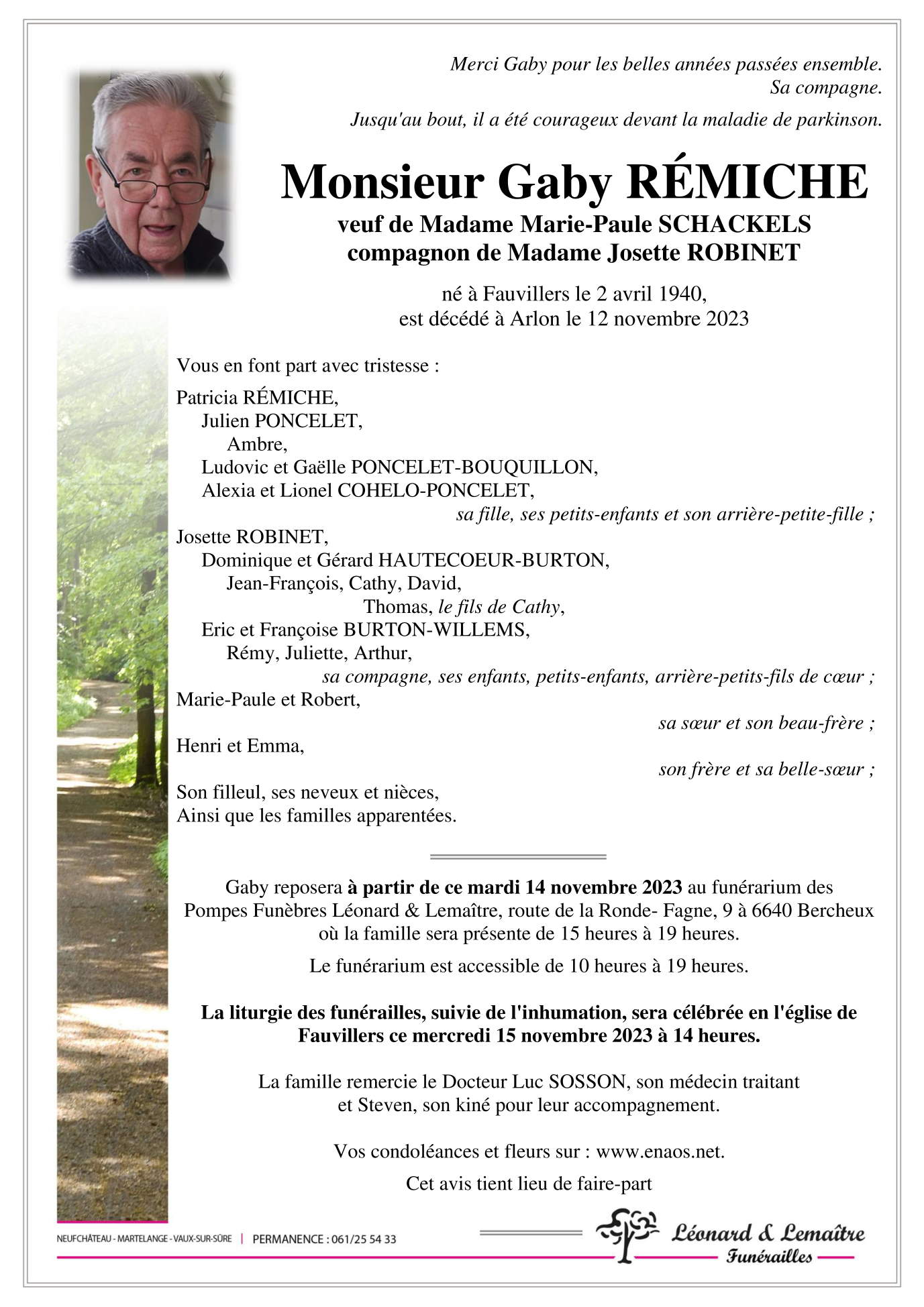 Décédé à Arlon (6700) le dimanche 12 novembre 2023 à l'âge de 83 ans