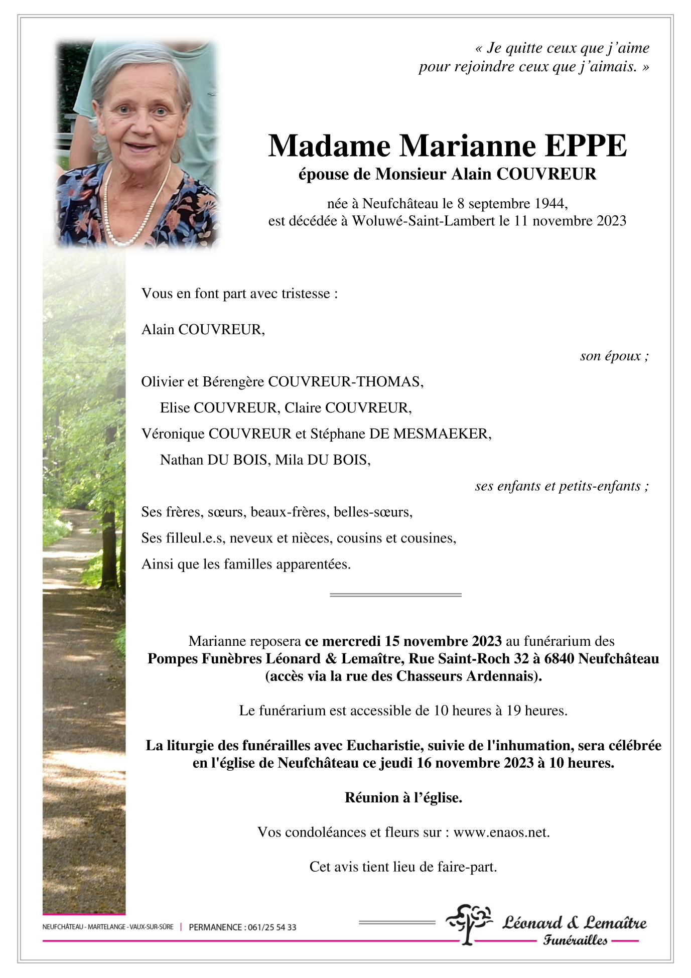 Décédée à Woluwe-Saint-Lambert (1200) le samedi 11 novembre 2023 à l'âge de 79 ans
