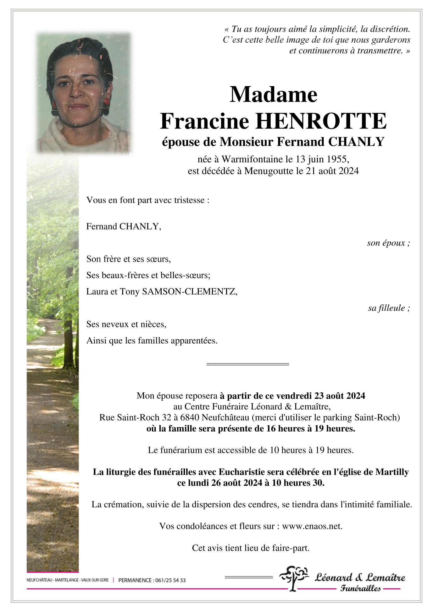 Décédée à Menugoutte (6887) le mercredi 21 août 2024 à l'âge de 69 ans