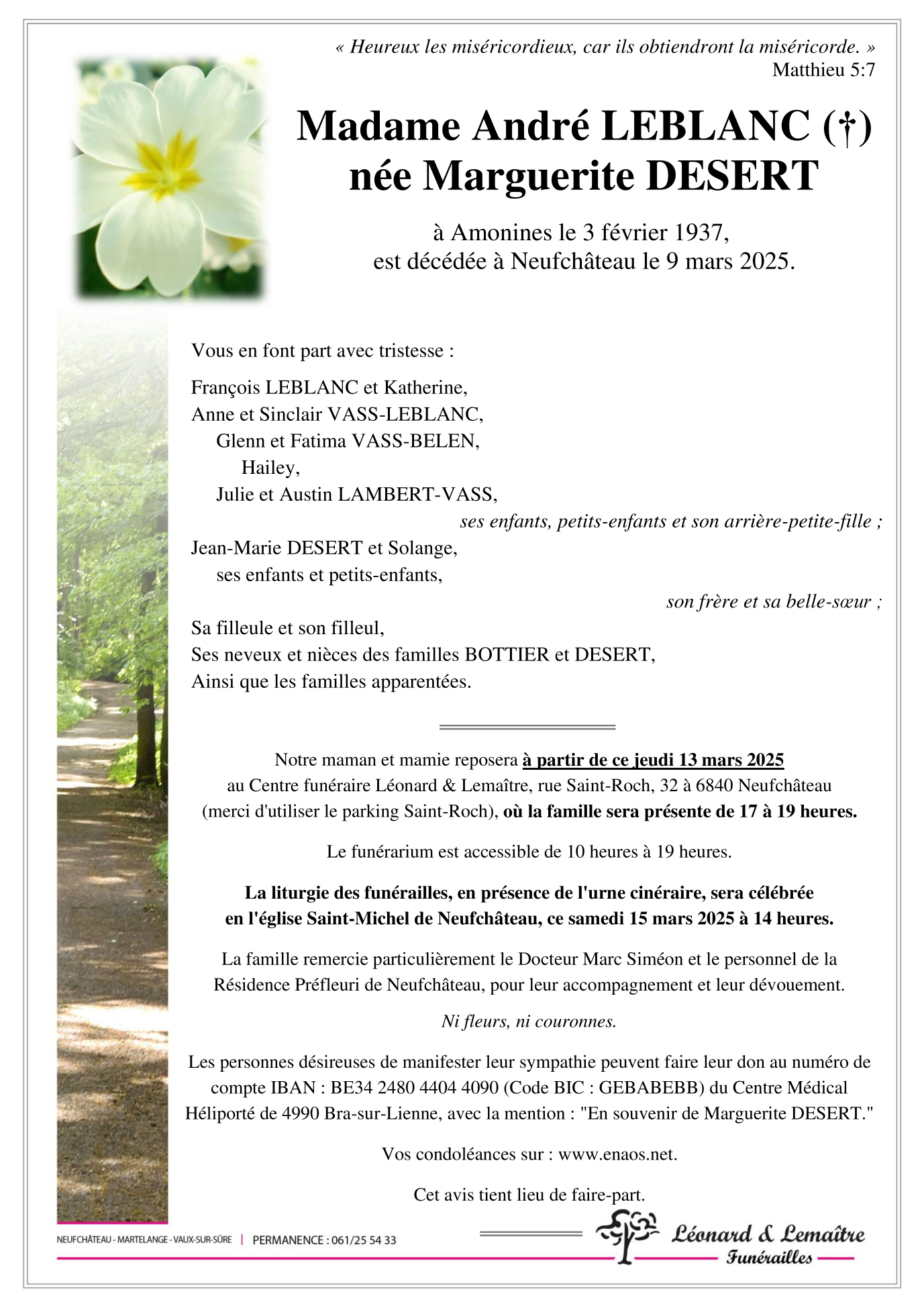 Décédée à Neufchâteau (6840) le dimanche 9 mars 2025 à l'âge de 88 ans