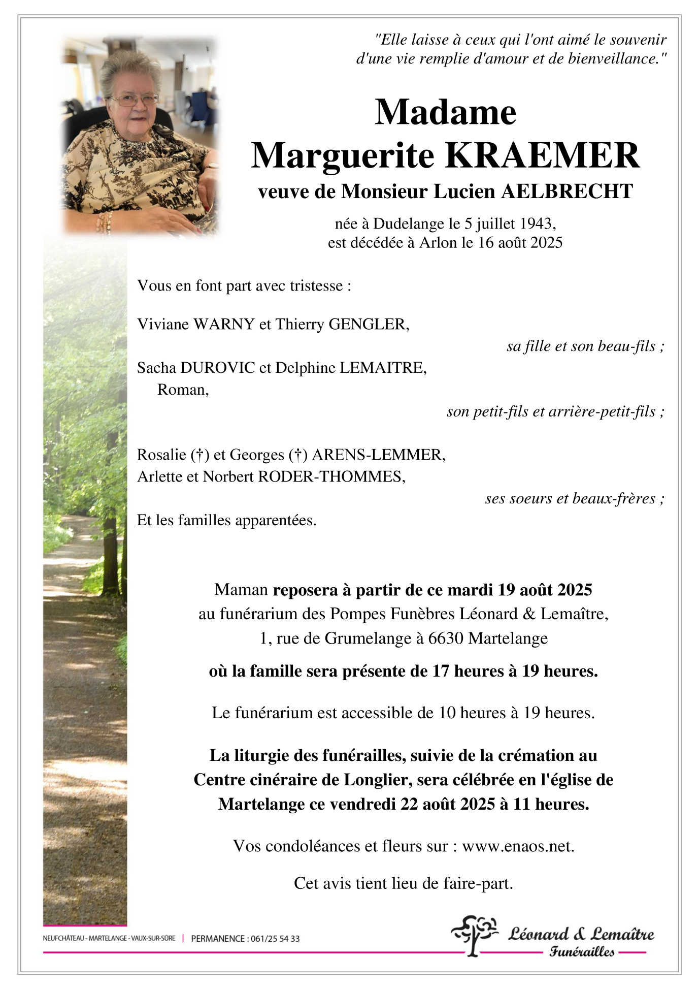 Décédée à Arlon (6700) le samedi 16 août 2025 à l'âge de 82 ans