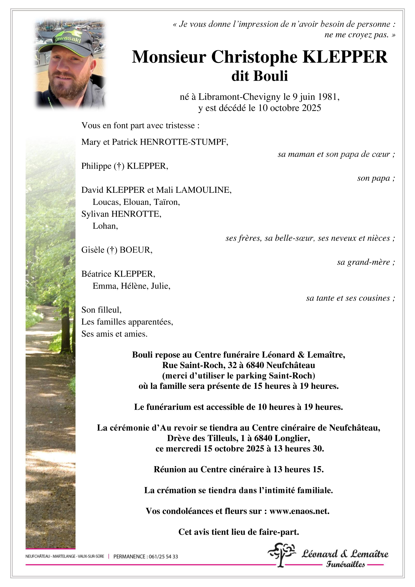 Décédé à Libramont-Chevigny (6800) le vendredi 10 octobre 2025 à l'âge de 44 ans