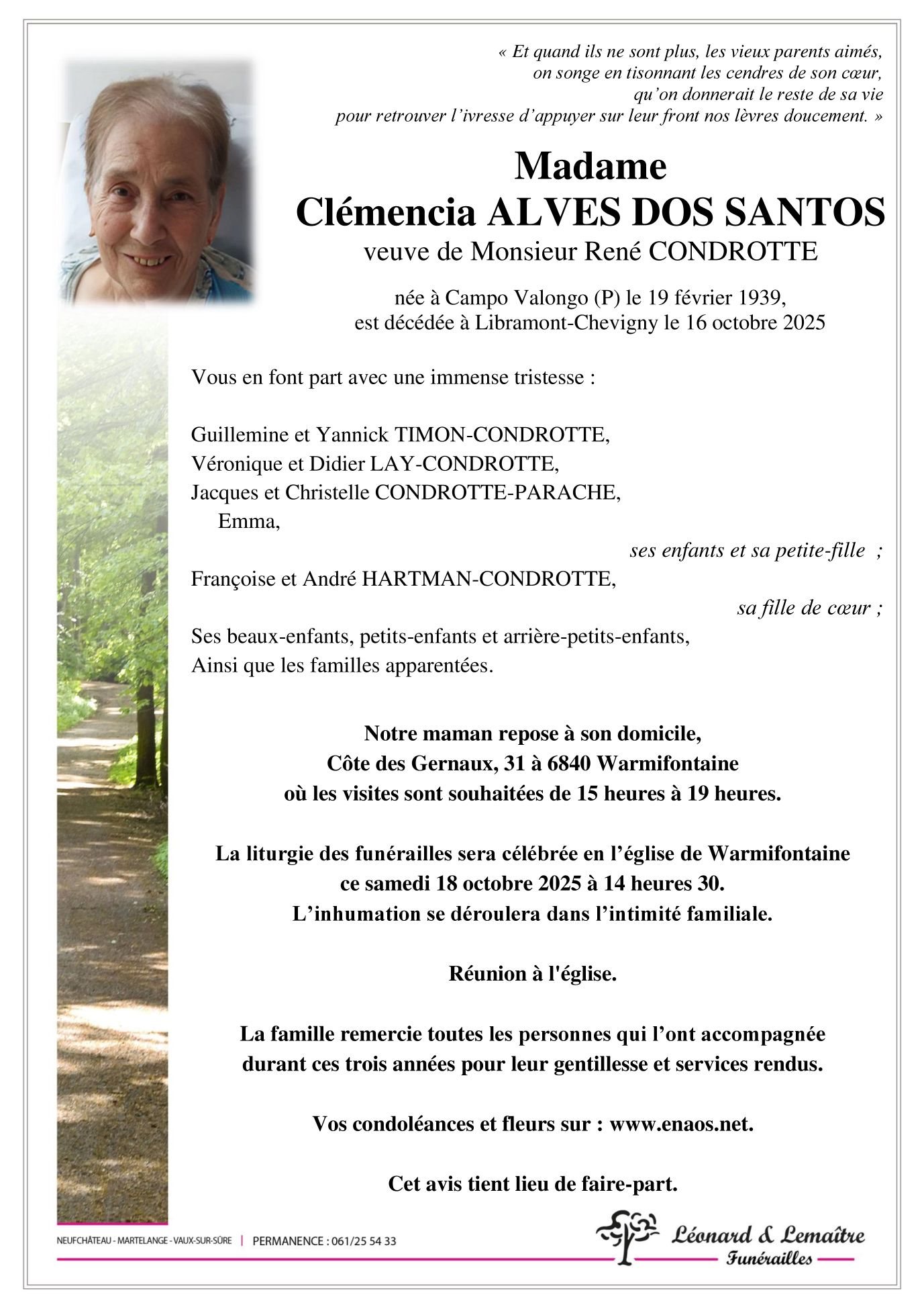 Décédée à Libramont-Chevigny (6800) le jeudi 16 octobre 2025 à l'âge de 86 ans