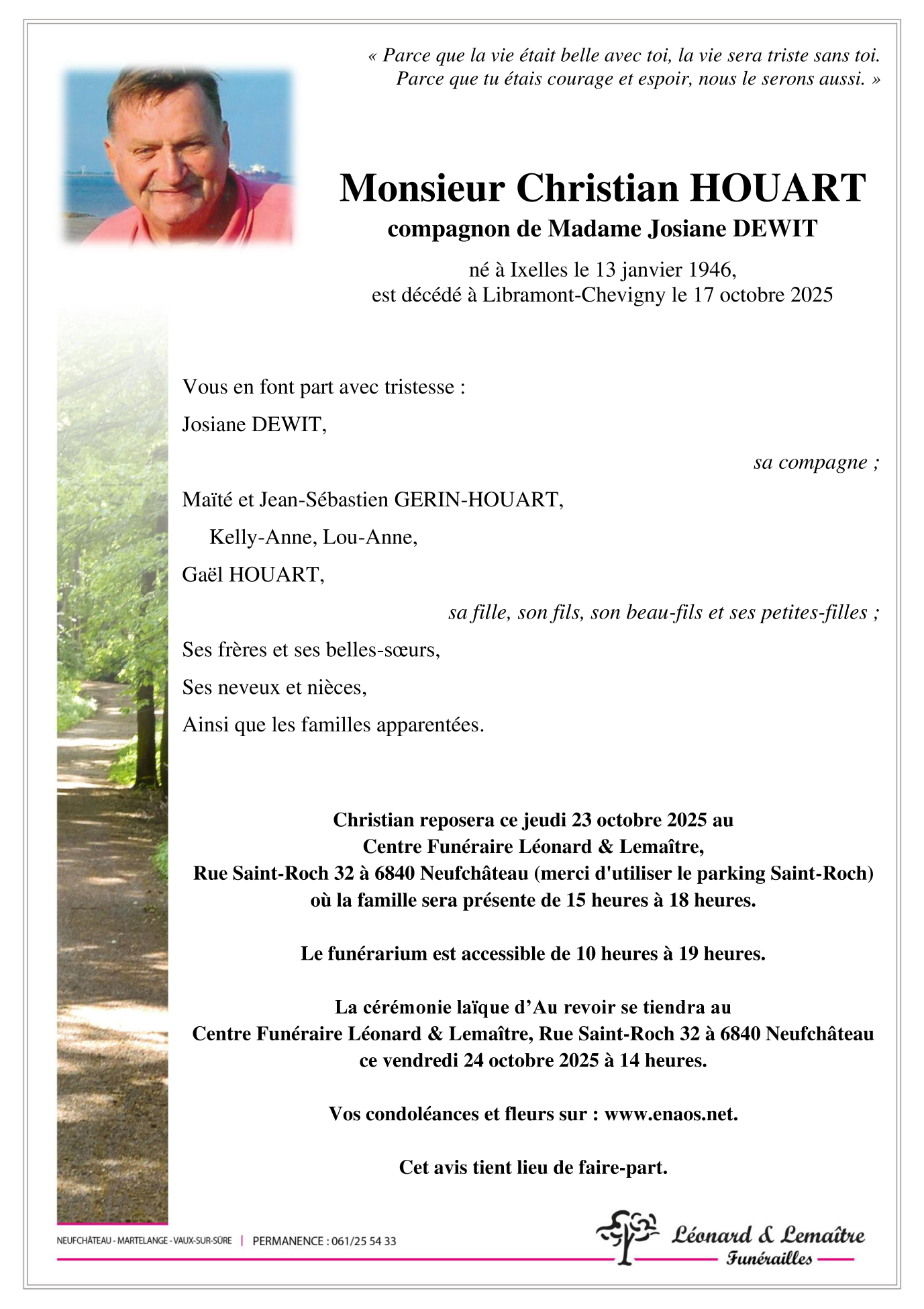 Décédé à Libramont-Chevigny (6800) le vendredi 17 octobre 2025 à l'âge de 79 ans