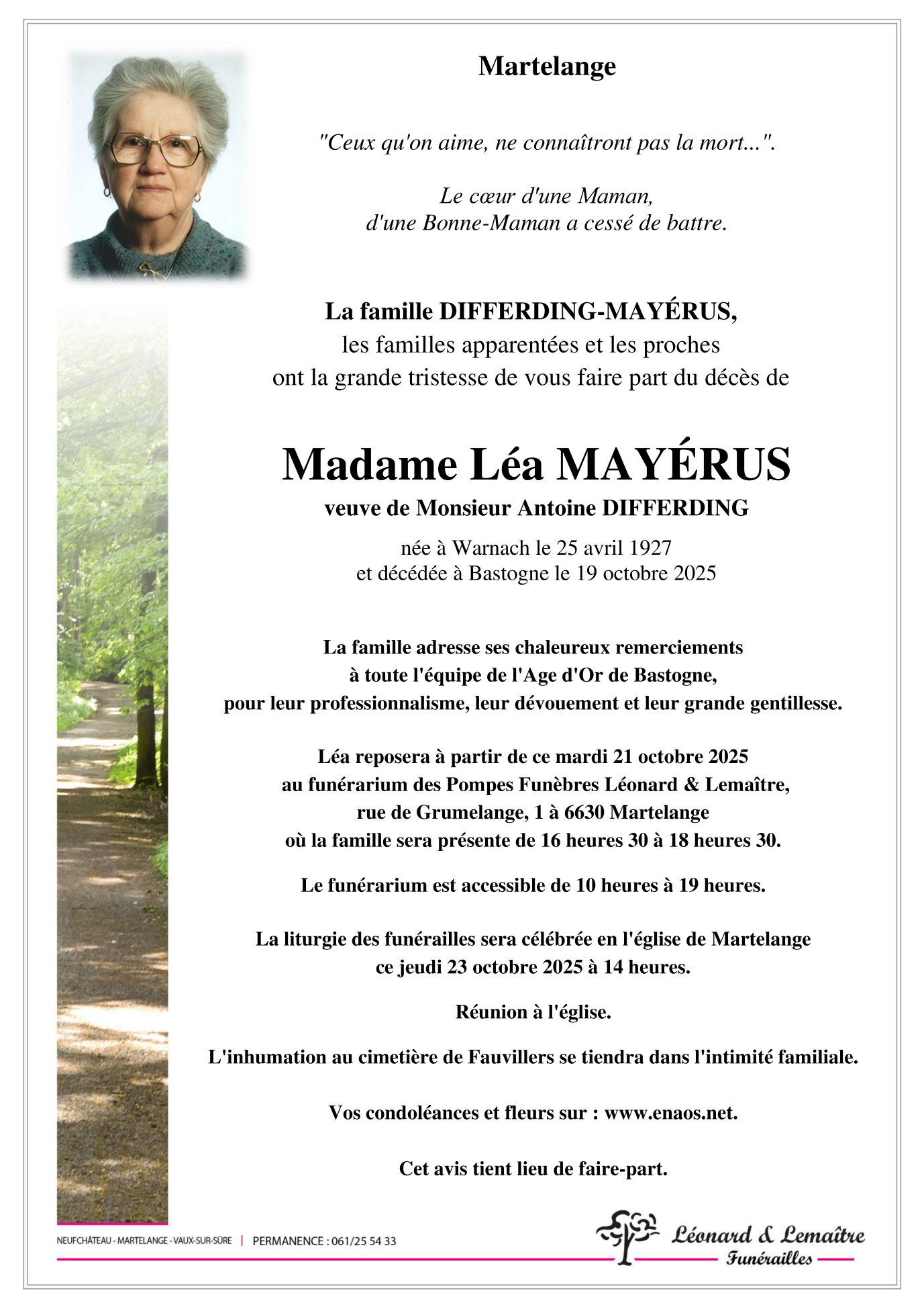Décédée à Bastogne (6600) le dimanche 19 octobre 2025 à l'âge de 98 ans