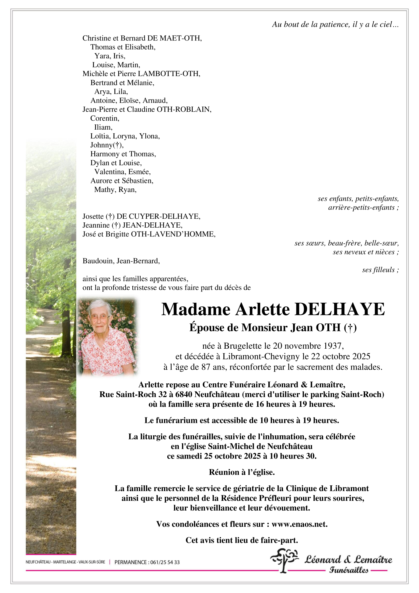 Décédée à Libramont-Chevigny (6800) le mercredi 22 octobre 2025 à l'âge de 87 ans