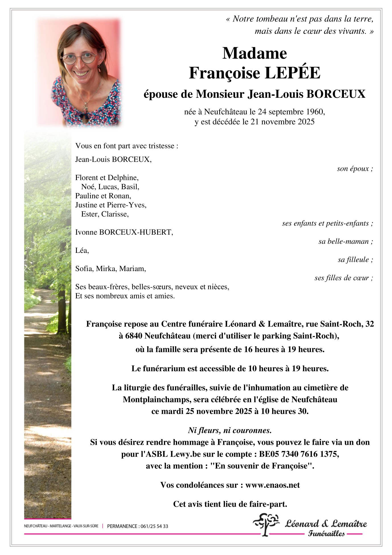 Décédée à Neufchâteau (6840) le vendredi 21 novembre 2025 à l'âge de 65 ans
