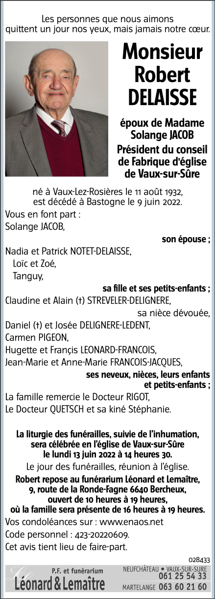 Décédé à Bastogne (6600) le jeudi 9 juin 2022 à l'âge de 89 ans