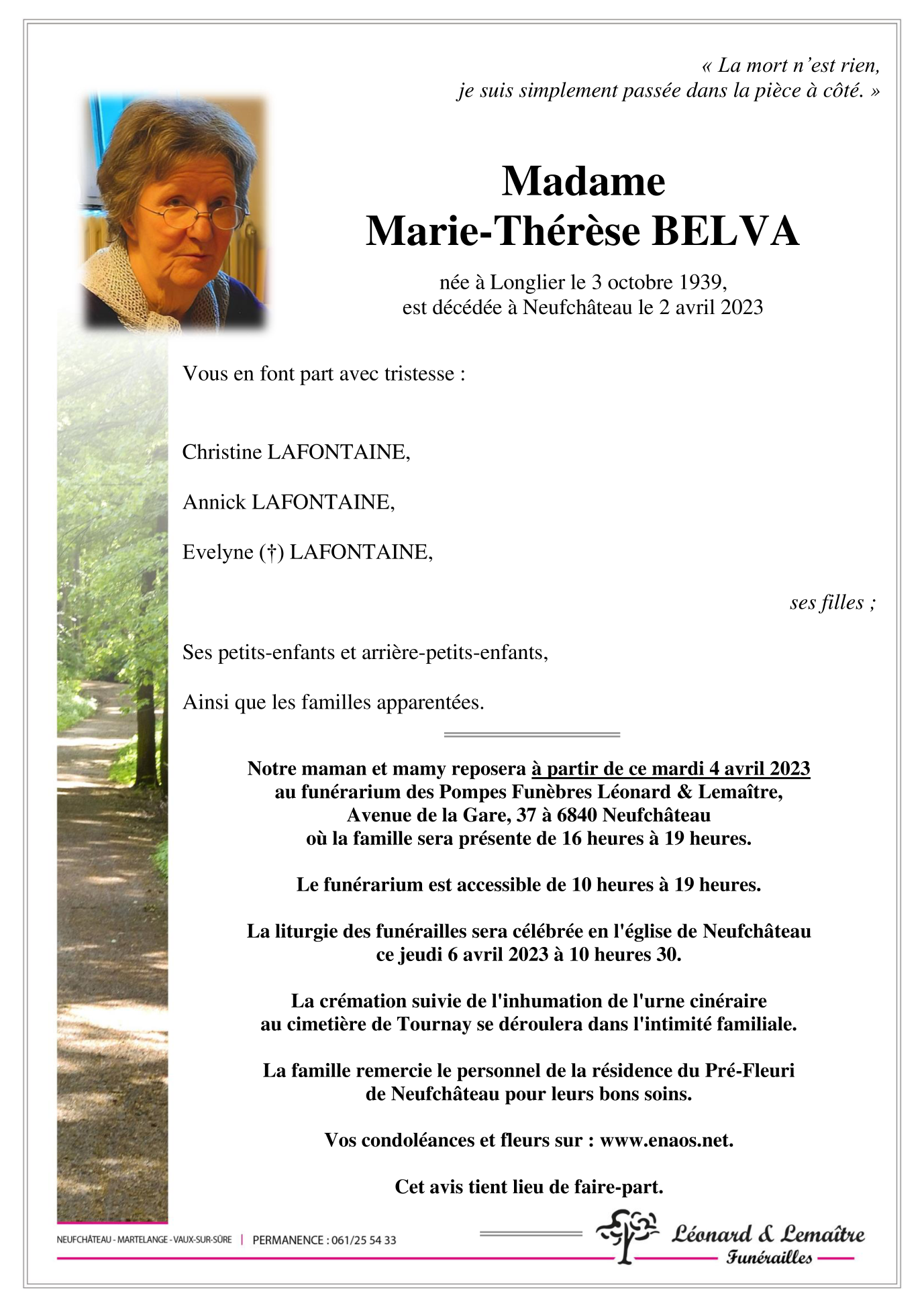 Décédée à Neufchâteau (6840) le dimanche 2 avril 2023 à l'âge de 83 ans