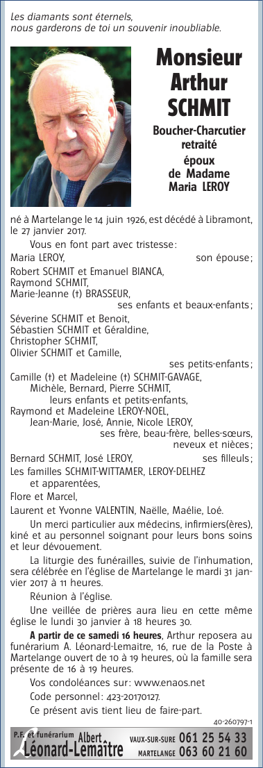 Décédé à Libramont-Chevigny (6800) le vendredi 27 janvier 2017 à l'âge de 90 ans