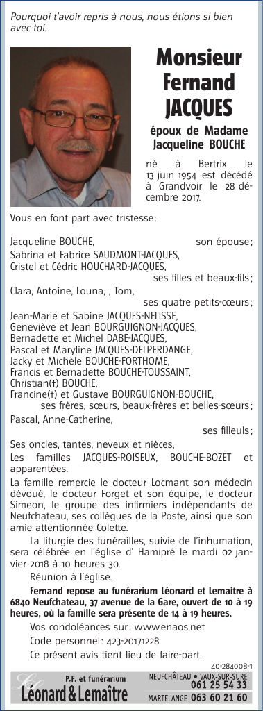 Décédé à Grandvoir (6840) le jeudi 28 décembre 2017 à l'âge de 63 ans