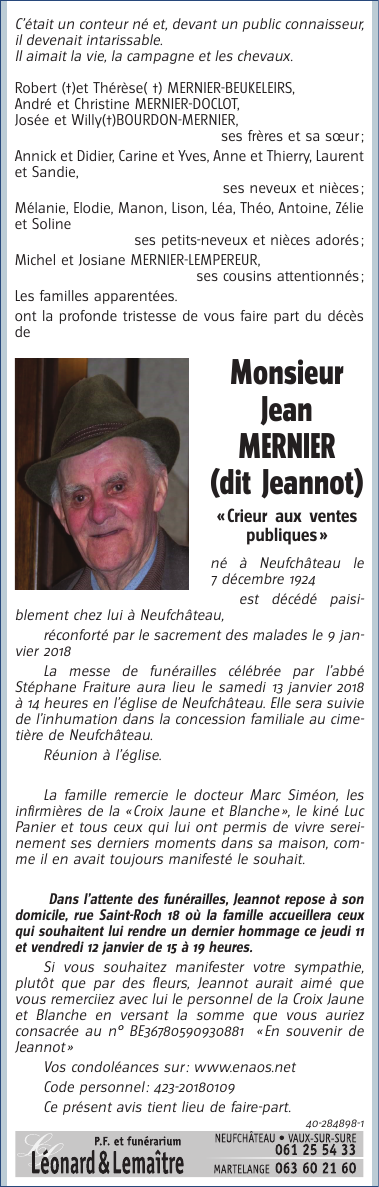 Décédé à Neufchâteau (6840) le mardi 9 janvier 2018 à l'âge de 93 ans